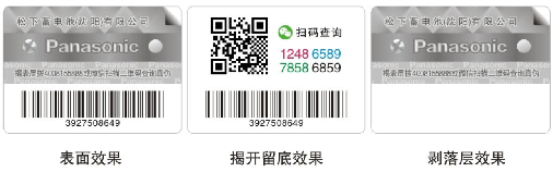 將防偽標簽表層揭開,見二維碼、16位紅、藍、綠、黑四色防偽數(shù)碼及10位物流碼。